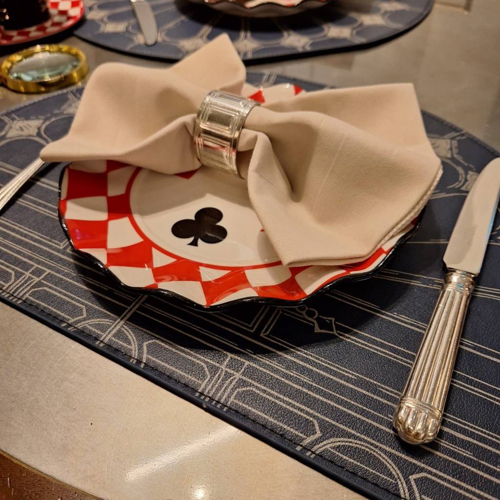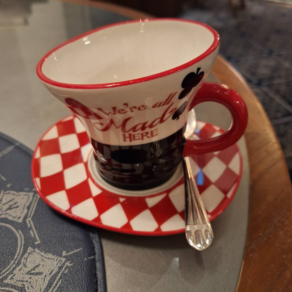 整套餐具走撲克牌主題紅黑白配色,印有梅花、紅心等花色圖案。歪斜茶杯上印有「It’s always tea time」與「We’re all mad here」等字樣,充滿瘋帽子式幽默。